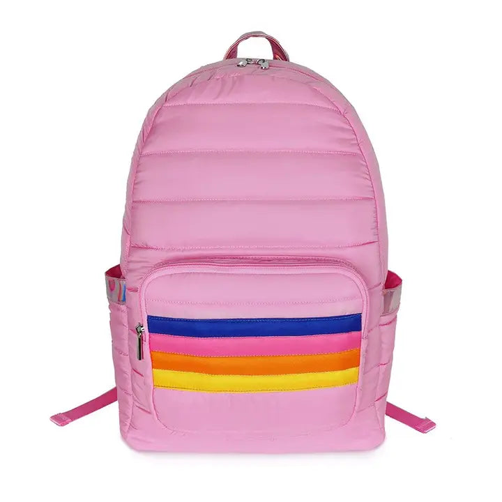 Your backpack now has style with this fun puffer backpack with a Pink puffer retro stripe pocket! Comes with 2 zipper compartments and a side pocket for your water bottle. Great for all students .
